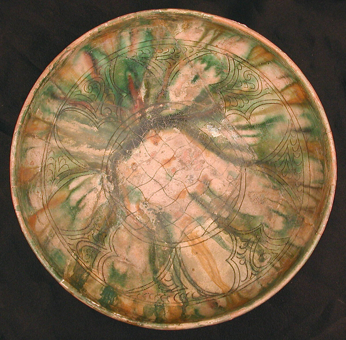 - Medium: Earthenware; white slip, incised and splashed with polychrome glazes under transparent glaze (sgraffito ware)