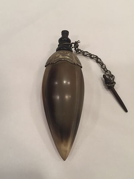 This vessel was designed to hold snuff, a form of tobacco that is consumed from the nasal cavity. The form is known as djouzet el-tenfiha, and this name refers to the coconut material from which it is made. The chain with the small rod would have been used to break up the tobacco and extract the substance from the container.