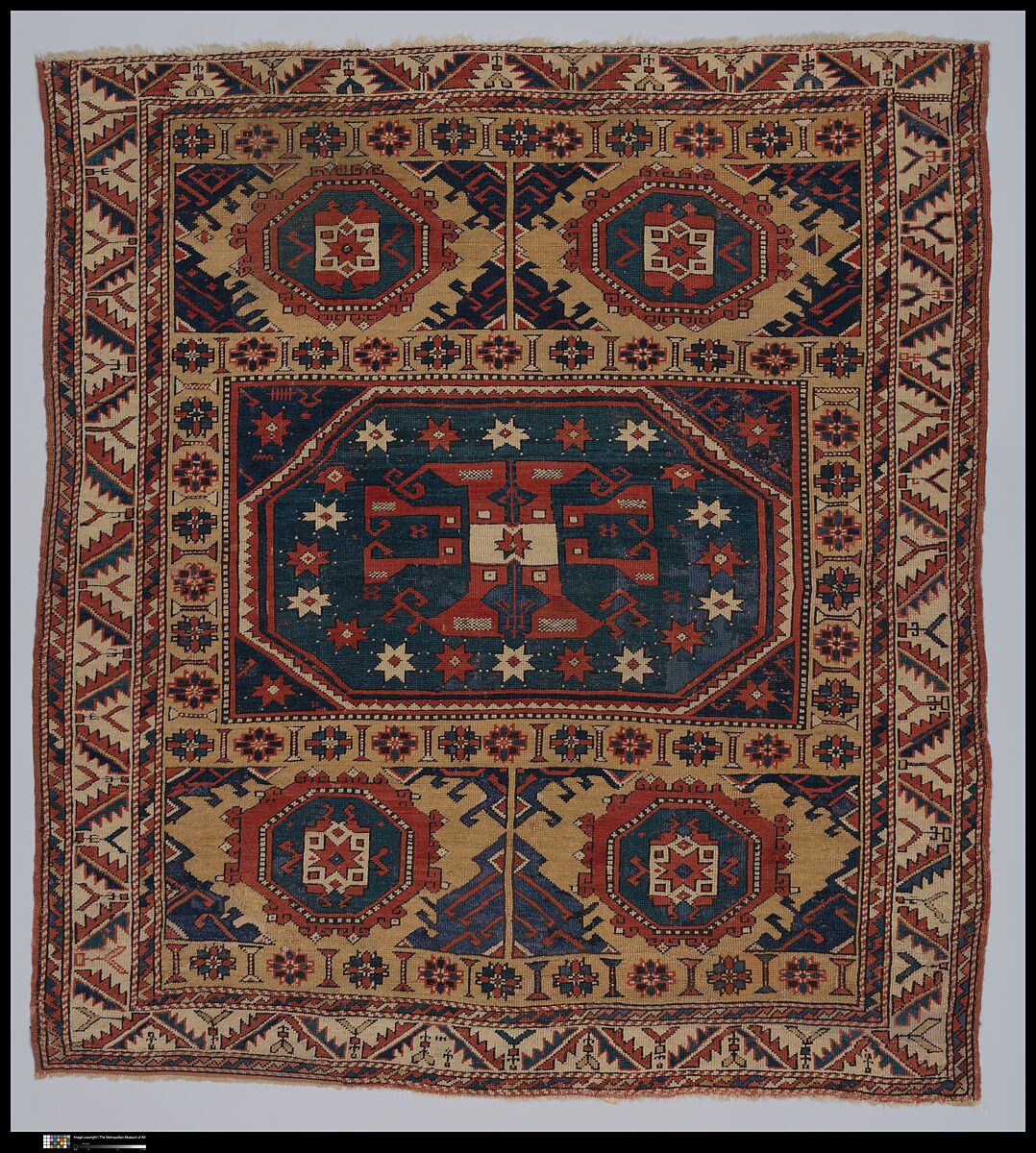 - Medium: Wool (warp, weft, and pile); symmetrically knotted pile