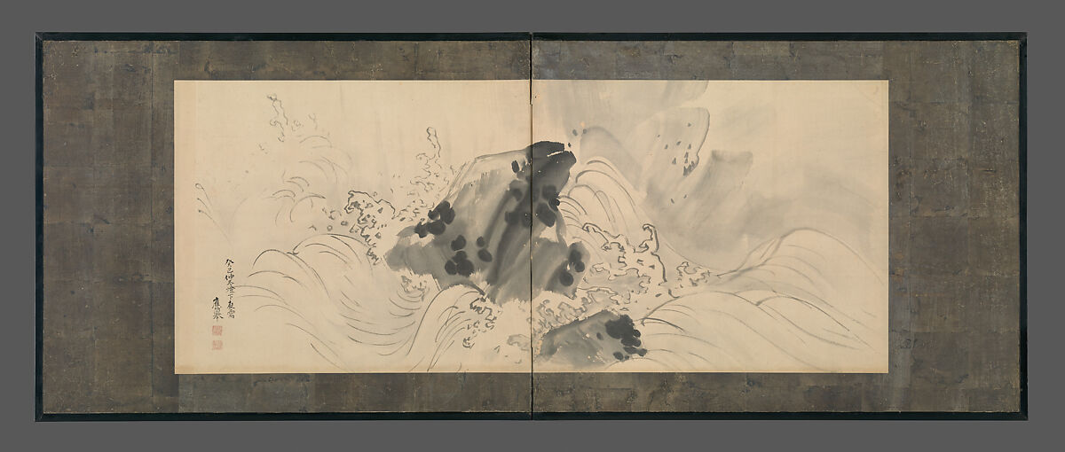 The many streams and rivers in the mountains around Kyoto surely were the inspiration for Ōkyo's prolific studies of rocks and water, in which he seeks to capture the peak moment of their incessant movement. This screen is one of the smaller paintings Ōkyo made of the subject, but it is a concise statement of the essential features of the wave as it lingered in his mind for so many years. Great commotion and energy converge on the obstinate stone in the center of the composition, the waves hurling themselves against it only to be thrown into the air. Ōkyo has skillfully taken advantage of the congruence between his subject and his ink-splash technique.