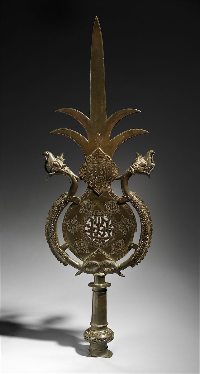 Standards are used in many parts of the Muslim world by the Shi'a community in processions marking the martyrdom of Imam Husain, grandson of the Prophet Muhammad, who died at the Battle of Karbala in A.D. 680. The pierced inscription at the center of this example reads "Allah, Muhammad, 'Ali," and these names are repeated in roundels surrounding the main inscription. Dragons encircle the central section and grasp it with their feet, while their tails intertwine at the bottom. Their bodies are pierced, and they have rounded scales on their backs, with nub-like legs.