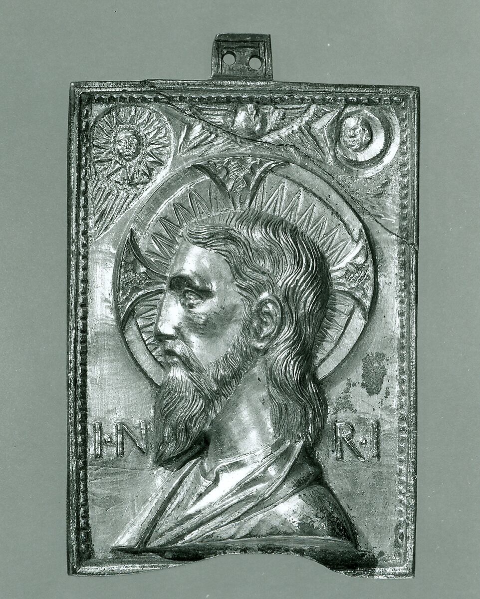 The bust of Christ with a cruciform halo is shown under the dove of the Holy Ghost, the sun, and the moon. This fine but partially cracked aftercast was made in the seventeenth or eighteenth century.