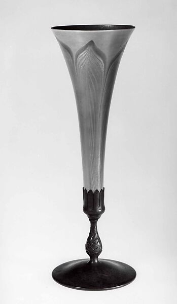 - Medium: Transparent amber and green lead glass, cast and patinated bronze sten and foot. Blown, trailed, iridized.