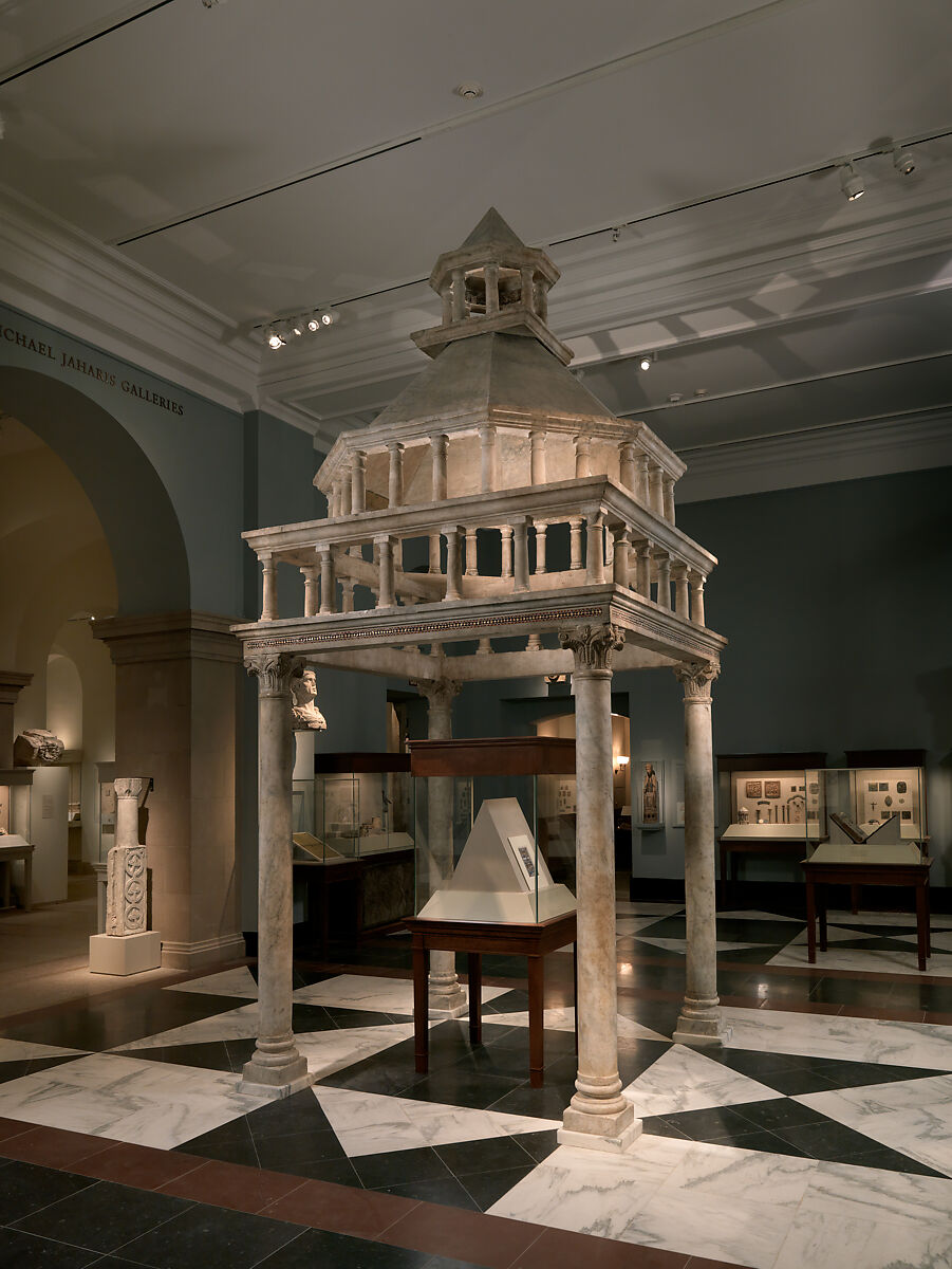A ciborium (altar canopy) sheltered and added focus to the high altar of a church. Here the simple but graceful architectural forms are enhanced with colorful mosaic and gold glass inlays. The Ranucius family of marble workers created this and other works for churches north of Rome.