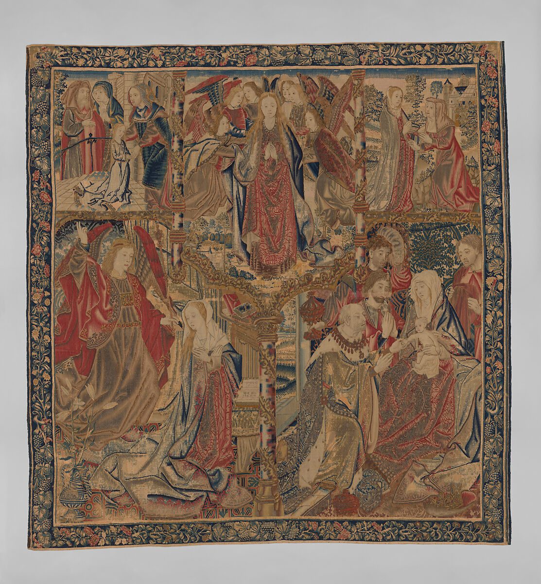 Wearing a red-and-gold brocaded dress and carried along by six angels, Mary ascends into heaven at the center of this five-part composition. Other episodes from her life unfold around this principal scene. Beginning in the upper left corner is the Presentation of the young Mary in the Temple, followed by the meeting of Mary and Elizabeth in the upper right corner. The Annunciation at left and the Adoration of the Magi at right dominate the lower field, their figures boasting exuberant costumes. The arrangement of the scenes in this tapestry gives preference to the most important episodes in Mary’s life rather than following a strict chronology. The tapestry’s relatively small size suggests that it was designed to hang alone behind an altar.