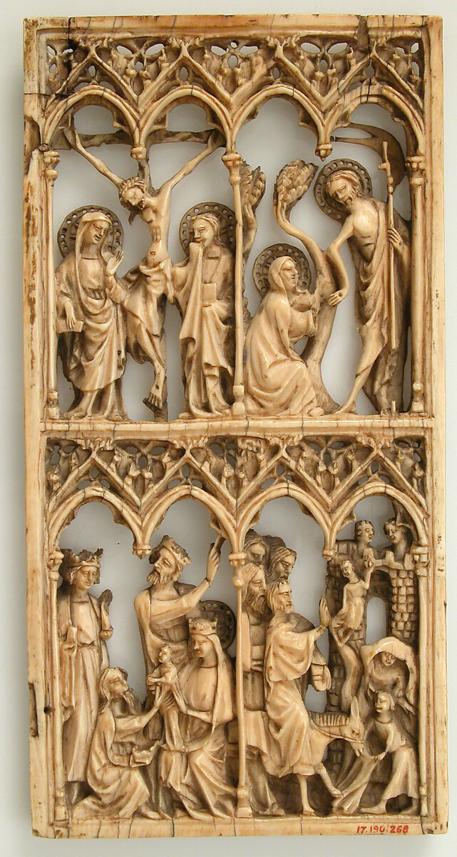 This openwork panel is unusual in many aspects, leaving its place and time of manufacture ambiguous. The panel is pierced entirely through, a method of carving typical of Europe during the later fourteenth and earlier fifteenth centuries. However, the presence of hinges is out of keeping with the normal construction techniques of pierced ivories, suggesting that it might be a later imitation of medieval ivory carving or a very early venture into this type of carving.