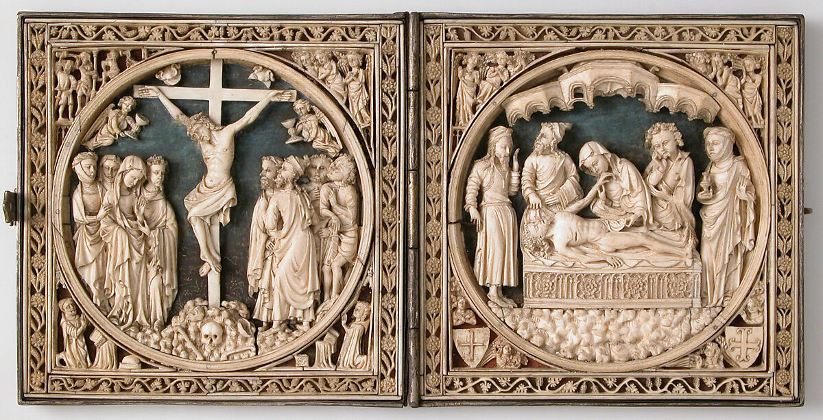 Housed in its original silver frame, this rare diptych contains delicately rendered figures and simplified coats of arms. The carver has adeptly captured the mourning figures in a moment of utter grief. This work is closely related to medieval sculptures created in the region of Hainaut, bordering present-day France and Belgium.