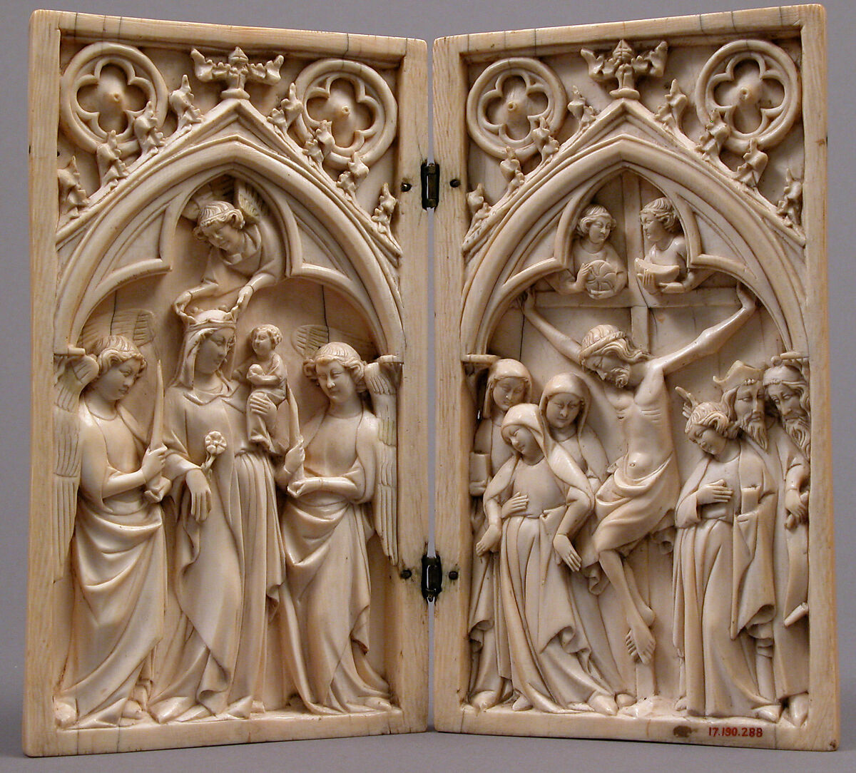 Paris became the principal center of ivory carving in Europe by about 1250 - a position it held for more than a century. This devotional diptych of exquisite quality juxtaposes the Glorification of the Virgin and the Passion of Christ. It opens like a book to be "read" in prayer.