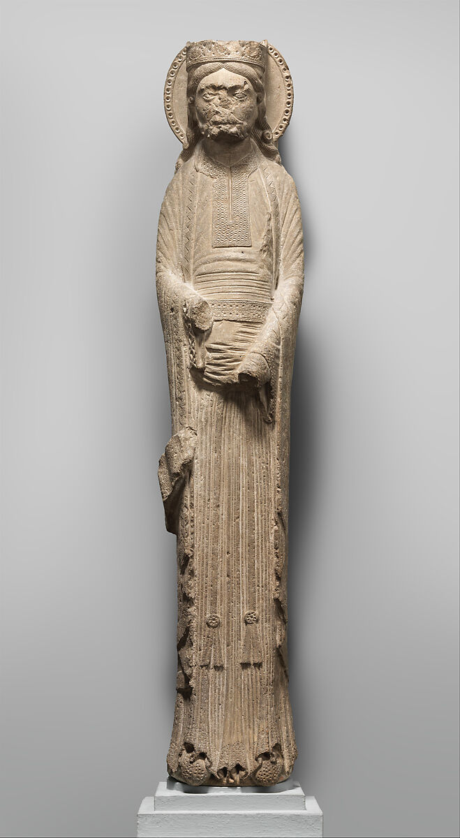 Questa immagine di un re non meglio identificato, è l’unica statua integra a noi pervenuta dal chiostro oggi distrutto dell’abbazia reale di Saint-Denis. L’aureola connota questo re come un santo. Sotto l’attiva guida dell’abate Suger, l’abbazia, in cui venivano seppelliti i re di Francia, fu ricostruita (1122-51) secondo lo stile “francese” come veniva definito il gotico nel Medioevo. Una delle caratteristiche di questo nuovo stile, il gotico appunto, era l’integrazione di figure erette in colonne cilindriche.