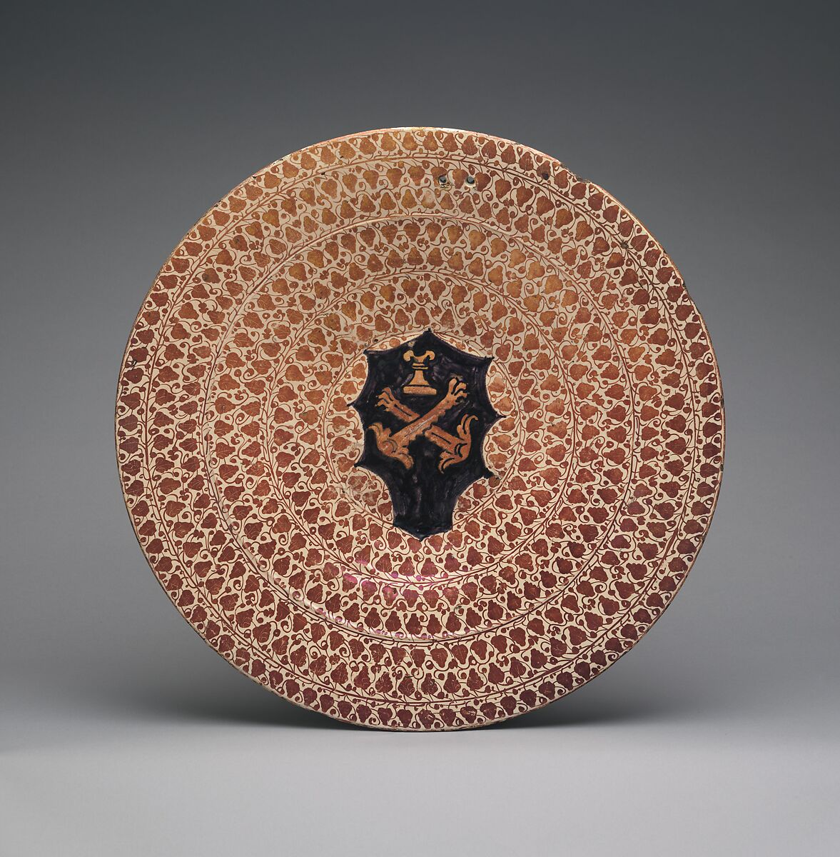 The holes in the plate, which appear on the majority of large serving dishes, may be explained by the firing process in which the plates were hung in a reducing kiln to avoid marring the glaze by contact with other objects being fired at the same time. The ivy pattern rendered completely in copper luster became an increasingly popular decorative motif toward the end of the century as potters more literally imitated the surface sheen of precious metalwork.
