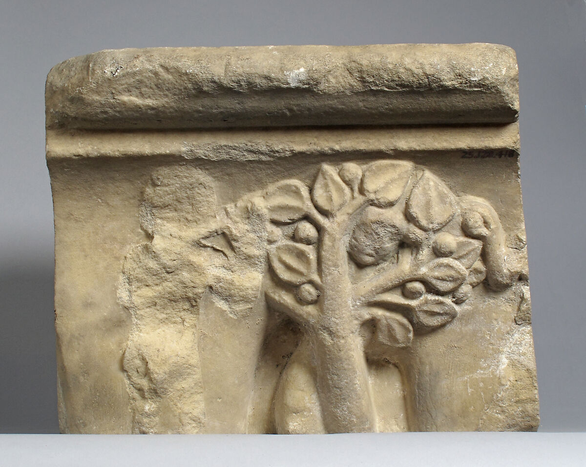Like many objects from George Grey Barnard’s collection, this fragmentary double capital has had an eventful history. Originally made for an unidentified cloister, one side depicts the Temptation of Adam and Eve, with the serpent slithering up the trunk of the Tree of Knowledge, its human face appearing amid the branches. In the sixteenth century, Protestant iconoclasts disapproving of the imagery disfigured the serpent’s face and Adam’s entire body. Later still, the sculpture seems to have relocated to someone’s garden, where it was repurposed into a sundial. The dial’s weathered markings and the date (1728) are visible atop the block.