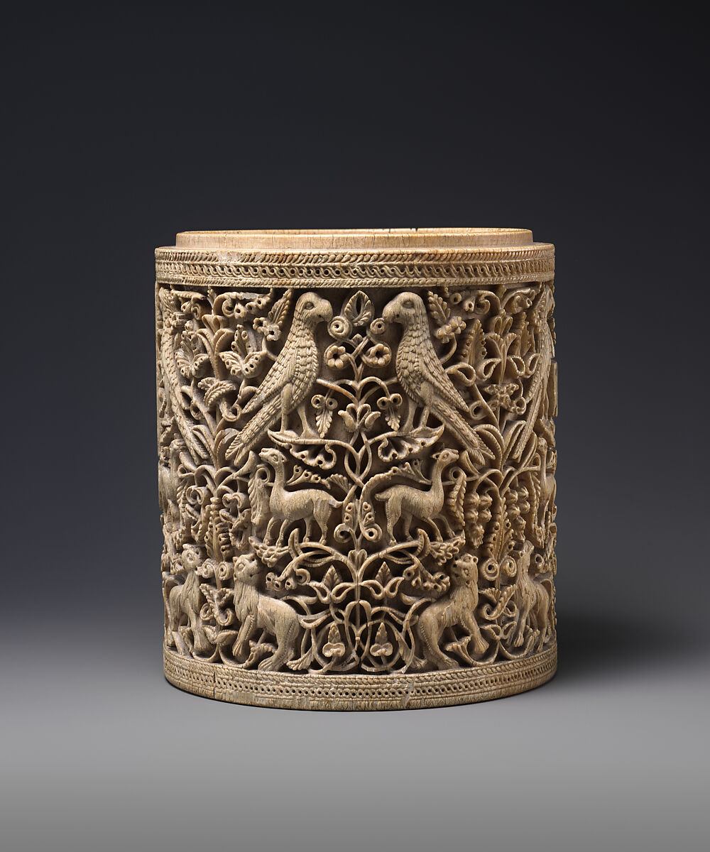 This exquisitely carved cylindrical box is believed to be one of the most accomplished works of a master from the palace of the Umayyad caliph ‘Abd al-Rahman III (r. 912–61), who ruled most of the Iberian peninsula. To judge from other examples, the missing domed lid of this box likely had an inscription giving the owner’s name and the date. Islamic pyxides, known as ushnan in Arabic, were exclusively secular and were used to store jewelry and cosmetics. The incorporation of birds, lions, and gazelles amid richly carved vine scrolls is typical of dense symmetrical Islamic design, which, in turn, influenced the decoration of European Romanesque ivories and manuscripts.