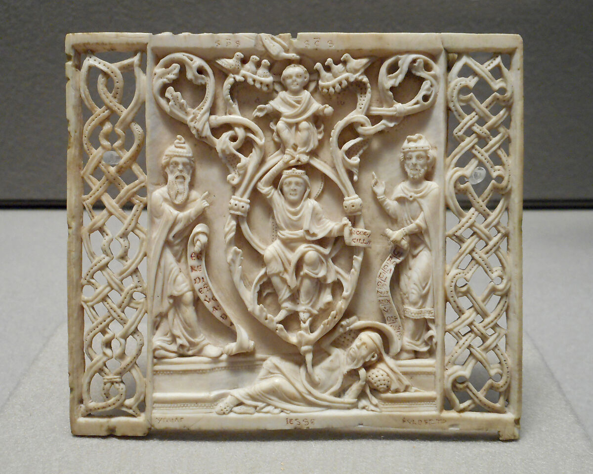 Liturgical comb fragment depicting the Tree of Jesse. Tree grows from loins of Jesse, contains the Virgin and above, the Christ child with the seven gifts of the Holy Spirit. Flanking the Virgin are the prophet Isaiah and Saint Fulbert, the twelfth century bishop of Chartres.