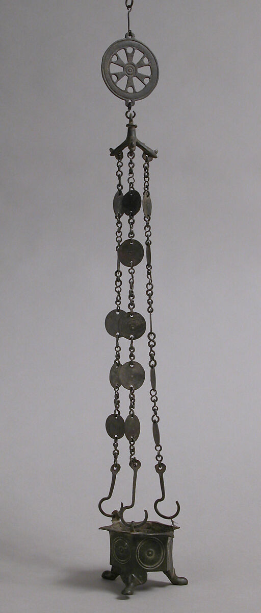 the sweet perfume of the incense that burned on hot coals within the vessel. The medallions on the long chains would have made changing patterns of light and dark as the censer was moved around the altar and over the Gospels and Eucharistic vessels. The large openwork medallion at the top is decorated with a variant of the Christogram, a monogram composed of the first two letters of Christ’s name in Greek, chi (X) and rho (P).