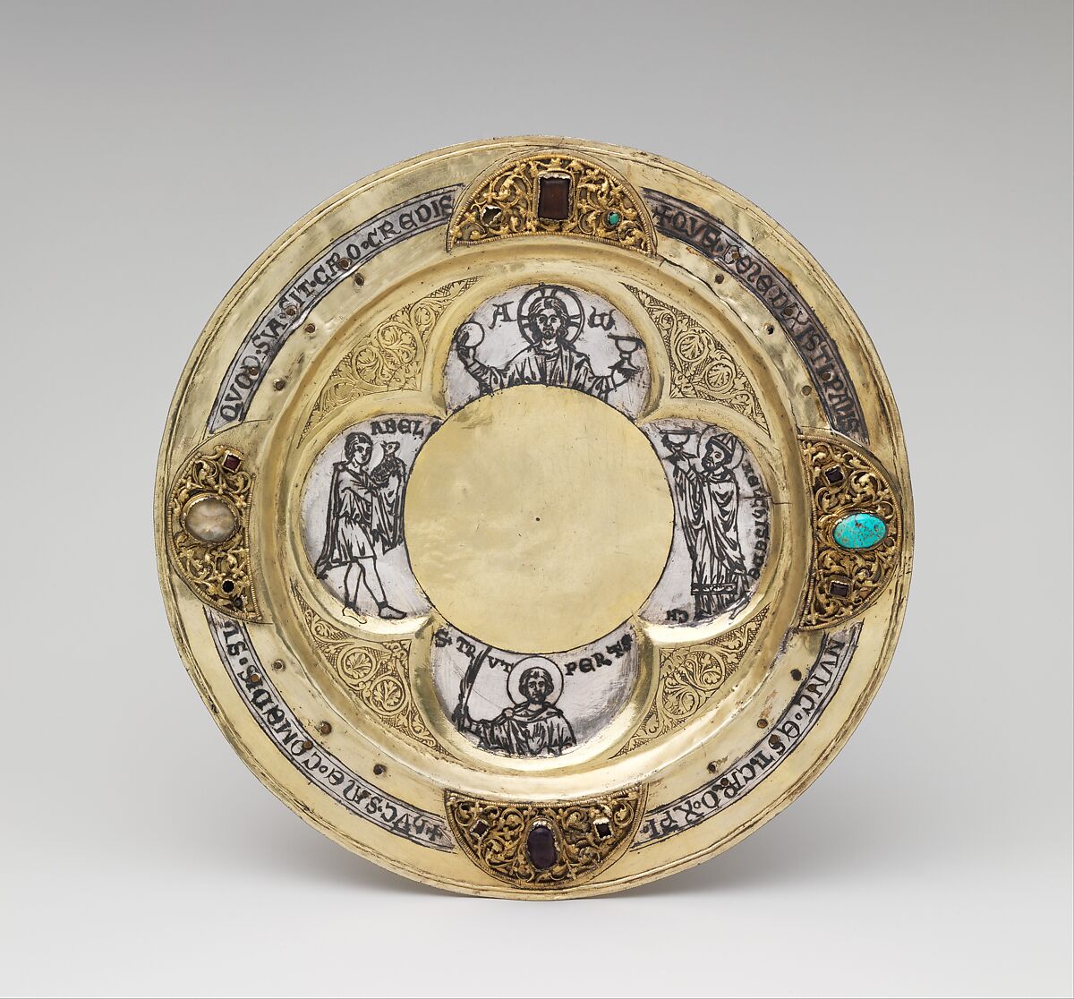 Questi oggetti sacri, sontuosamente ornati con motivi disegnati da un sottile fil di ferro e da immagini a repoussé e niello, furono creati per essere utilizzati durante la messa: un piattino (patena) per il pane e un calice con cannuccia per il vino. Le cannucce, spesso in coppia, erano talvolta usate per evitare di versare il vino consacrato come sangue di Cristo. Sul calice e sulla patena sono abbinate scene della vita di Cristo con storie del Vecchio Testamento che ne rappresentano il prologo. La coppa del calice è decorata tutt’intorno dai dodici apostoli, mentre san Trudperto, patrono del monastero nei pressi di Freiburg im Breisgau da cui provengono questi oggetti, è in grande risalto sulla patena, di fronte a Cristo nel medaglione in alto.