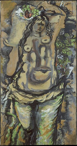 The ample forms of the nude woman suggest abundance and fertility. The painting belongs to a series of draped female figures entitled Canephorae (Offering Bearers), in which monumental figures display luscious fruits in the classical tradition of Greek statues.