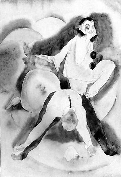 Between 1915 and 1919 Demuth produced a number of figurative watercolors as illustrations for specific literary works, and also as independent narratives that reflected his enjoyment of vaudeville, circus, social club, and music hall entertainments. The sexual permissiveness that characterized the bohemian scene in New York, where he was then living for part of the year, is often felt in these works. Here, two men, one dressed as a clown, the other in a shirt and tie, cavort suggestively.