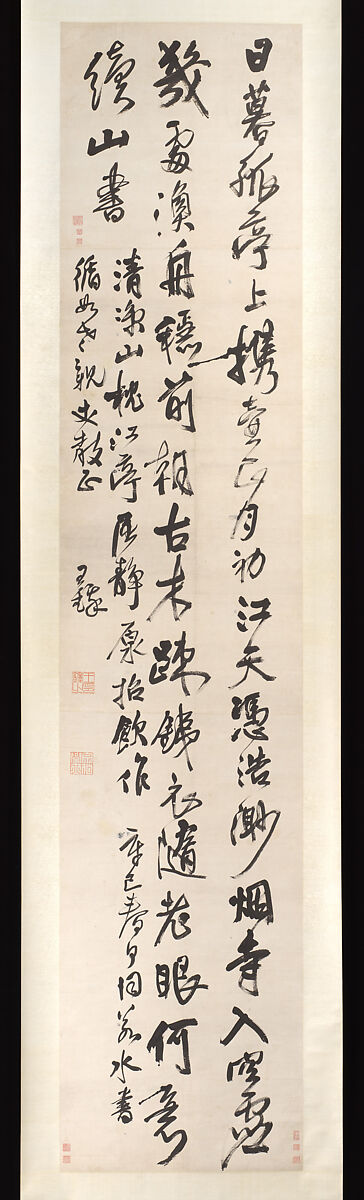 Like many of his large scrolls of boisterous calligraphy, Wang Duo wrote this one while drinking with friends. Though the calligraphy is rough and bold, the poem describes a scene of sparse tranquility. The opening quatrain reads: