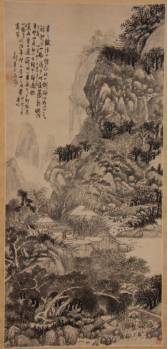 Wang Duo, believing that "the creation of extraordinary landscape scenery comes first," returned to the monumental landscape motifs of the Northern Song to express his dissatisfaction with Dong Qichang's (1555–1636) credo: "In considering the wonders of brush and ink, landscape cannot compete with painting." This scroll, executed one year before Wang's death, is an eloquent statement of his fondness for pictorial content. Known more for his calligraphy than for his painting, Wang reduced the rich detail of tenth- and eleventh-century landscapes to simple graphic conventions. Heavily contoured trees, many with leafless, stubby branches; schematic dotting on the summits of the mountain peaks; and starkly outlined rock formations all recall the tenth century master Fan Kuan. The prominence of figures, buildings, and pathways, in striking contrast to the generally uninhabited landscapes of Dong Qichang, emphasizes the Song idea that paintings should be places in which to wander and dwell.
