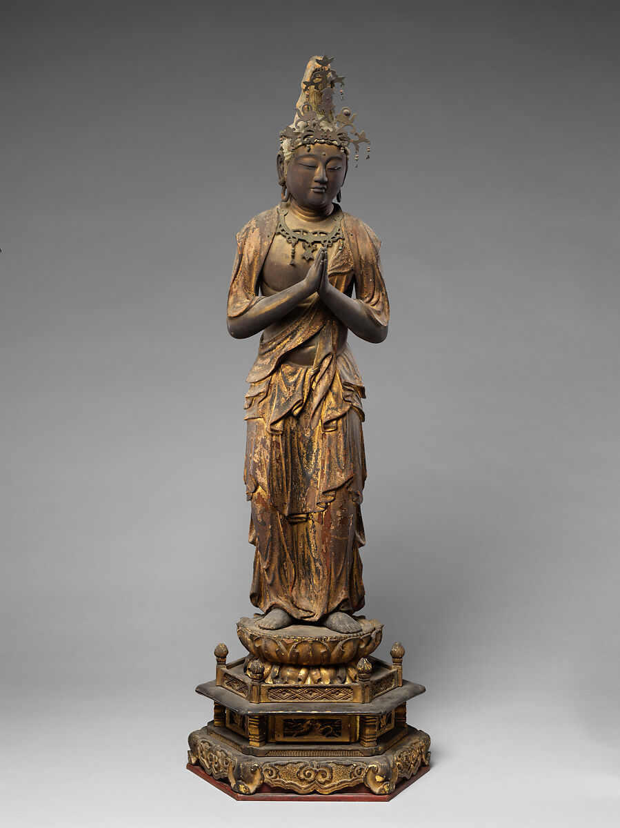 This sculptural configuration, known as an Amida Triad (Amida-sanzon), visualizes the “welcoming descent” (raigō) of Amida Nyorai (Sanskrit: Amitabha Tathagata) to this world, along with his heavenly retinue, to provide salvation for believers at the time of death. Amida, the Buddha of Limitless Light, sits upon a lotus pedestal at the center of the altar. He is flanked by his attendant bodhisattvas, Kannon (Sanskrit: Avalokiteshvara) at his right and Seishi (Sanskrit: Mahasthamaprapta) at his left.