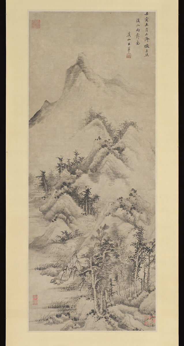 Freely adapting elements traditionally associated with Juran (act. ca. 960–85)—conical mountains defined by "hemp-fiber" texture strokes and topped by dense groves or clusters of boulders interspersed with foliage dots—and mixing them with the "cloudy mountains" imagery of Mi Youren (1074–1151), Wang has dematerialized the tenth-century master's substantial forms by paring down motifs, flattening forms into calligraphic patterns, and using subtly graded ink washes to evoke a serene landscape cloaked in clouds and mist. While the painting's moist atmosphere is characteristic of Juran, the seamless progression of repeated triangular hills from front to back reveals Wang's method of integrating pictorial elements within a zigzag compositional pattern he called a "dragon vein."
