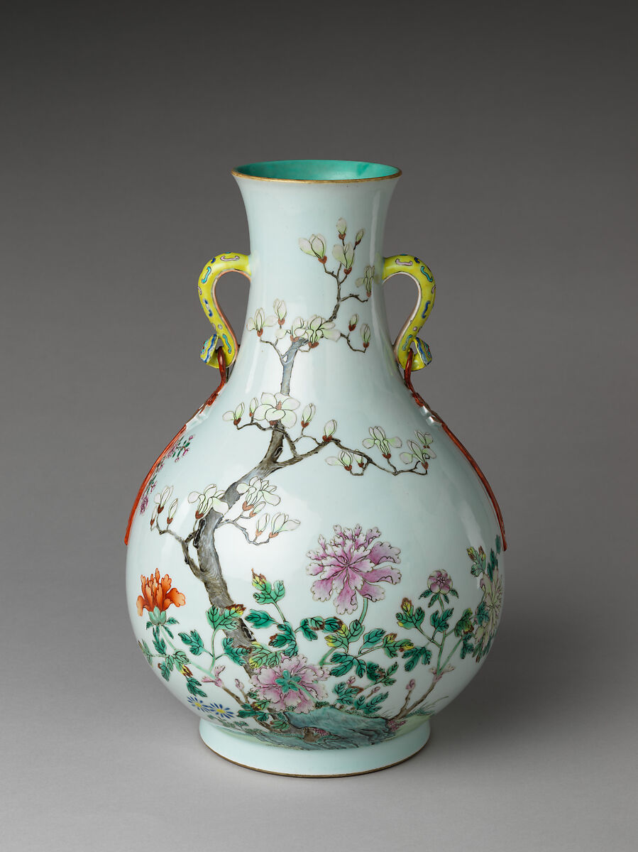 The delicate pink in this painting illustrates the development of new colors in the eighteenth century. Opaque white derived from a lead arsenite and pale pink tinted with bits of gold were added to the palette and combined with existing colors to create a range of hues on the flowers. In traditional Chinese art, peony and magnolia is a classic combination symbolizing grace and fortune.