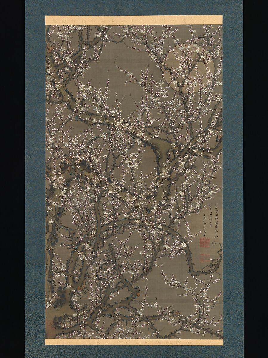 A large full moon is sole witness to a miraculous burst of white blossoms emerging out of a gnarled, old plum tree in the stillness of night. Itō Jakuchū, who painted this extraordinary, dreamlike image, was counted as one of the Three Eccentrics of the Edo period, together with Soga Shōhaku (1730– 1781) and Nagasawa Rosetsu (1754–1799). In his exuberant depictions of plant life, he combined seemingly incompatible elements, such as realism with brilliant color and decorative abstraction.