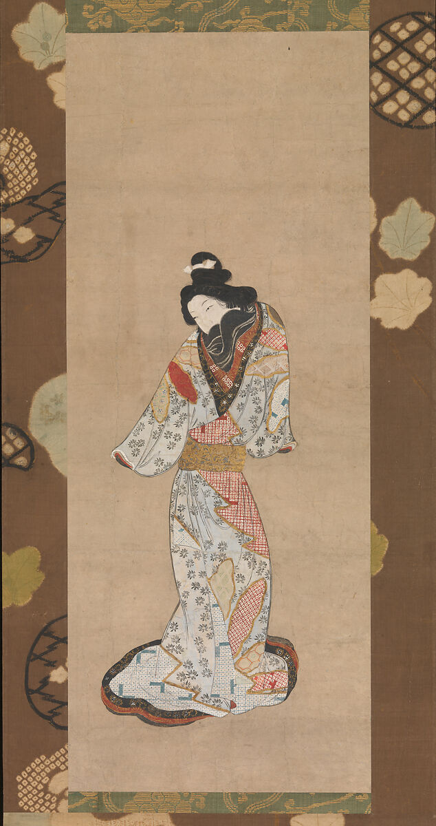 Kanbun bijin, or “Beauty of the Kanbun Era,” is a generic name given to paintings of a woman standing against a neutral background. The tall woman wears her hair in an elaborate style called gosho-mage, or “palace chignon.” The designs on her outer kosode include areas of “fawn-spot” tie-dyeing interspersed with flower patterns, while decorated underlayers are also visible. Around the Kanbun period (1661–73) the width of the obi sash was still quite narrow.