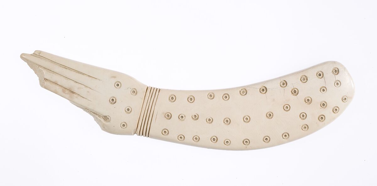 This clapper is shaped like an arm and a hand. The fingers and a broad bracelet are indicated by incised lines. Additional roundel ornaments decorate the arm and hand; they are typical of Middle Kingdom clappers, but their significance is unclear. The clapper was found together with at least thirteen more; for more information see 22.1.143a, b.