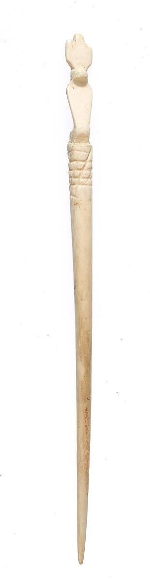 This ivory hair pin is decorated with the image of a uraeus cobra wearing a sun disk on its head. The snake is shown with its hood open, ready to strike. Its tail is coiled around the end of the pin.