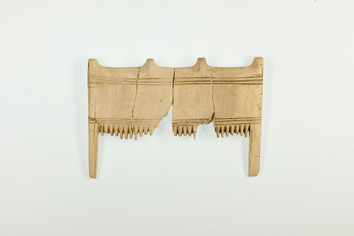 This comb and two others (16.1.428, 16.10.430) were found in the remains of an anthropoid (human-shaped) coffin that was excavated by the Museum's Egyptian Expedition in 1916. Although the dimensions vary slightly, all three have shape that is typical of the late-Seventeenth and early-Eighteenth Dynasties. For a similar comb from the same time-period, but made of wood, see 26.7.1448.