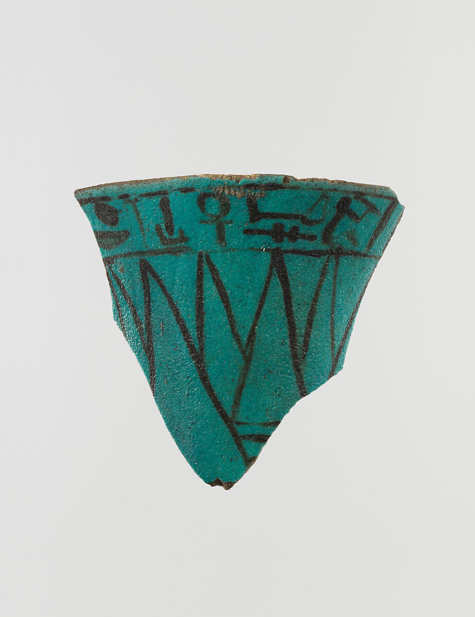 This rim fragment of a lotiform chalice is painted with black. The lower part depicts lotus sepals; around the rim is inscribed: "..y, may she give life, prosperity, and health every day."