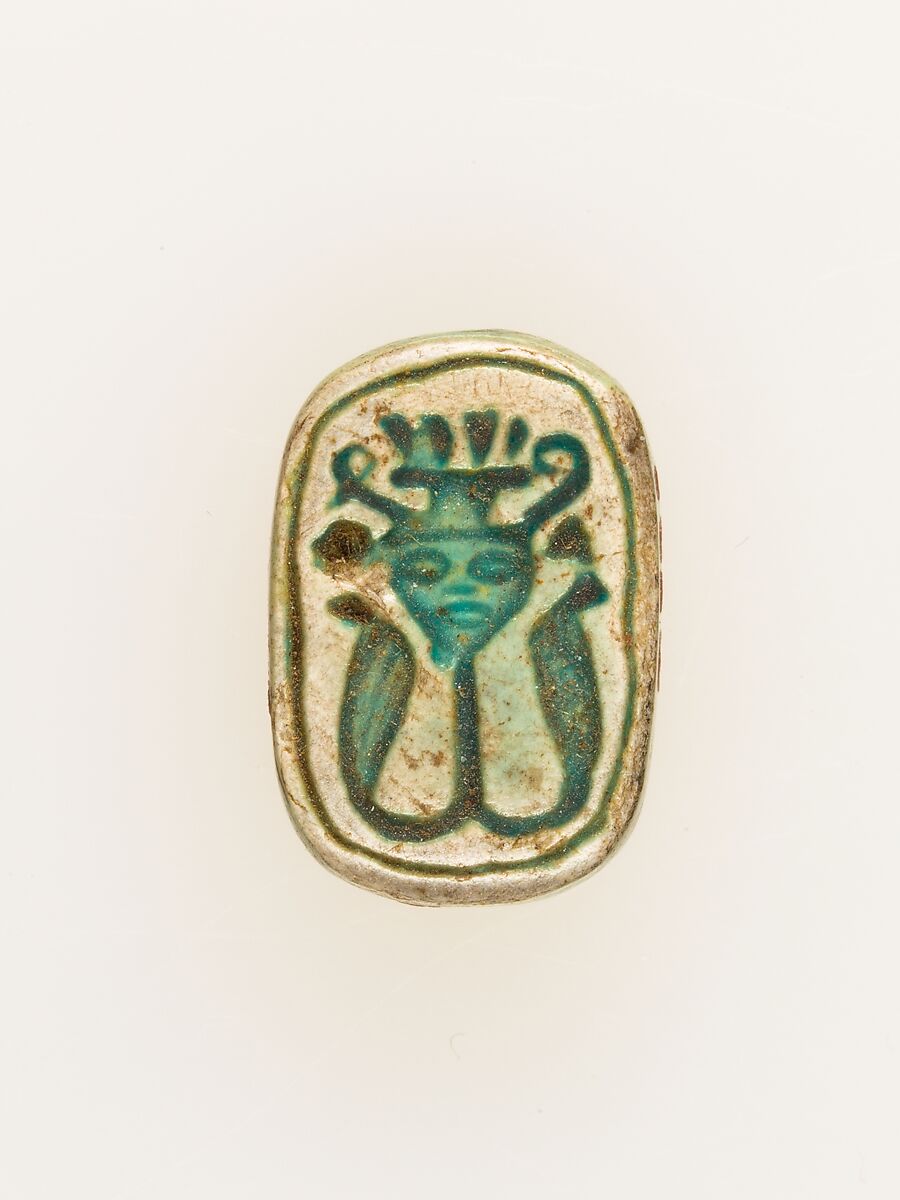 This goddess face is flanked by the uraei that often accompany Hathor. Loop elements rise above the podium crown. These have sometimes been interpreted as a row of uraei, and by the later eighteenth dynasty this may be the case. However, the modius with uraei appears on queens’ crowns only in the time of Amenhotep III, so early loop crowns probably represent something else, possibly feathers like those worn on crowns by Bes and Anuqet.