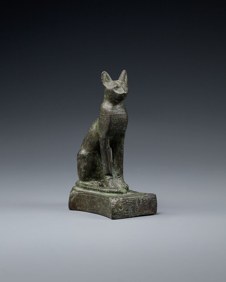 Bastet was a powerful goddess of Lower Egypt, one who was protective and could bring about great prosperity. In zoomorphic form, she was represented as a cat and cats were considered sacred to her. This cat sits on a menat-shaped base in a typical pose, upright with its tail wrapped along its right side. It is poised and alert, on guard against external forces. A worn inscription on the base preserved Bastet’s name and parts of the donor’s parents’ names.