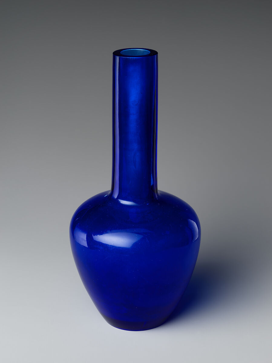 Clear glass was likely initially produced at the Qing court to create lenses for telescopes and other practical tools before being put to more decorative use through the creation of small bottles, boxes, and vases. Since glass and enamel share a similar chemical composition, the cobalt pigment that lends this vessel its deep blue color was likely also used in enameling of the period.