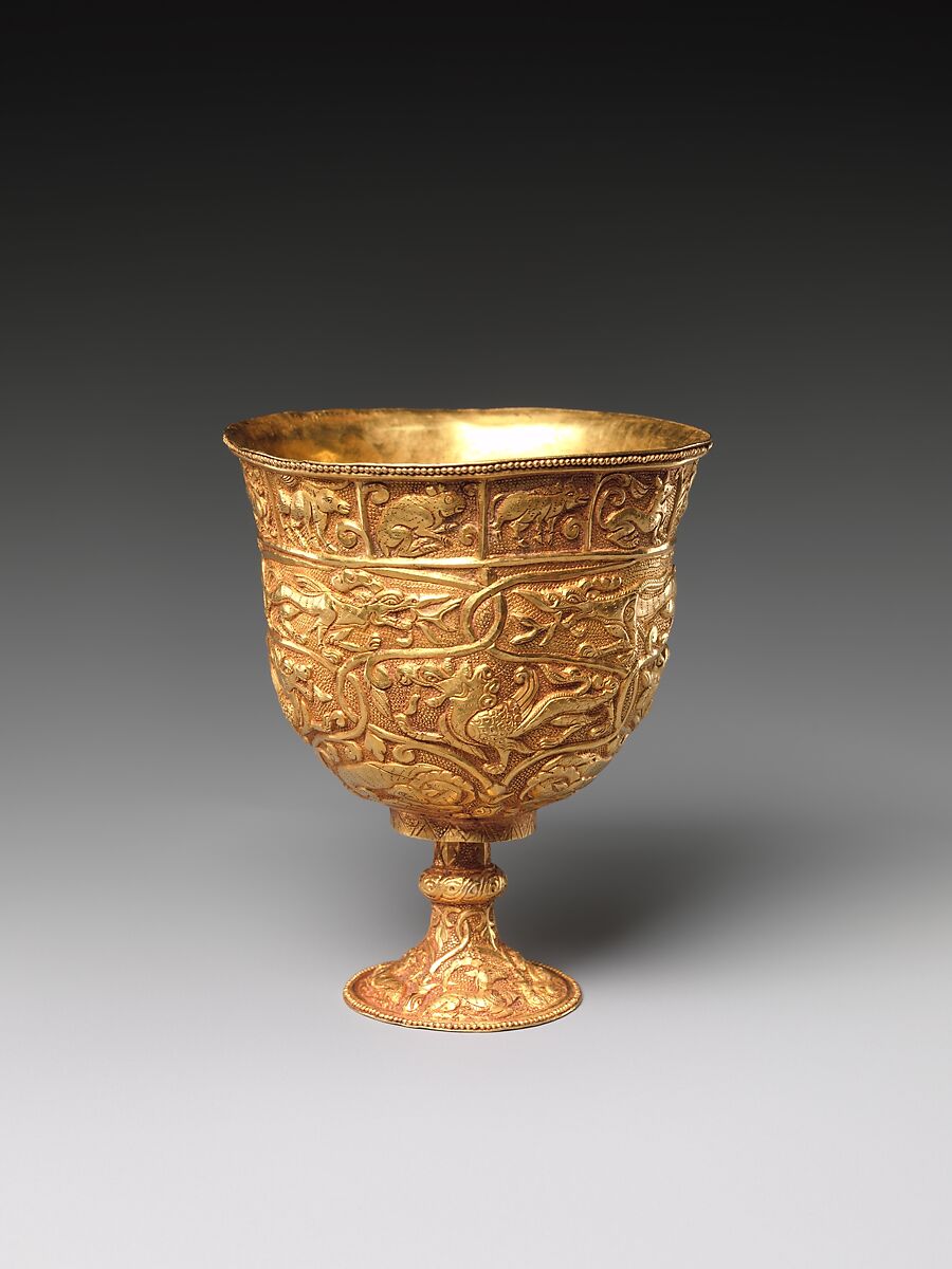 Occupying a portion of the ancient Silk Road that bridged China and Central Asia, the Western Regions (Chinese: Xiyu) played an active role in intercontinental trade and cultural exchange from the seventh to the ninth century. The twelve zodiac animals on this gold cup indicate the influence of Chinese culture, while the intertwined vines encircling hybrid animals reflect Sogdian and Persian metalworking practices of ancient Iran.