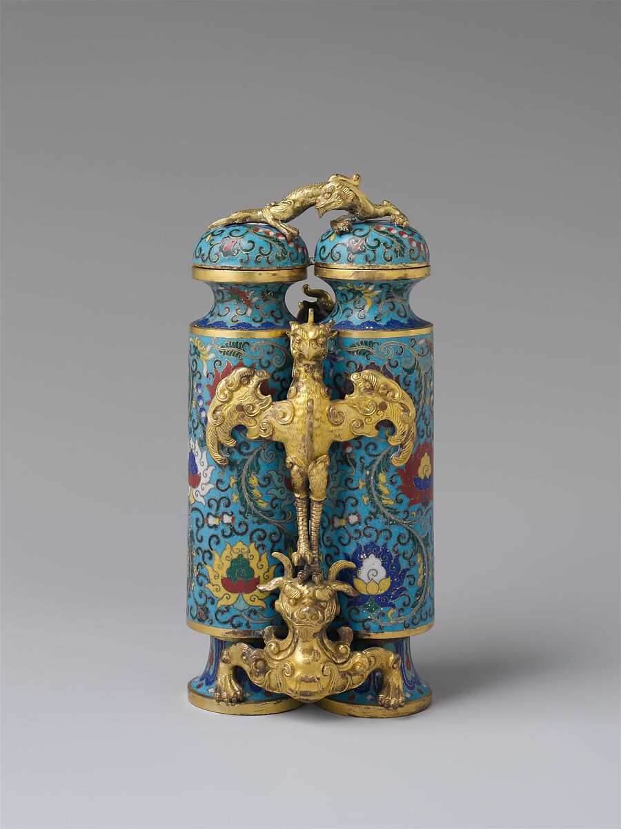 This type of vessel, with two narrow vertical compartments connected by a carving of a mythical bird, is known as a “champion vase” in Western writings. The name may be a loose translation of yingxiongbei, or “hero’s cup,” referring to the eagle (ying) and the bear (xiong) supporting it. Based on an archaic bronze type that can be traced back to the second century BCE, champion vases were revived beginning in the sixteenth century and were subsequently manufactured in different media, including cloisonné, jade, and rhinoceros horn.