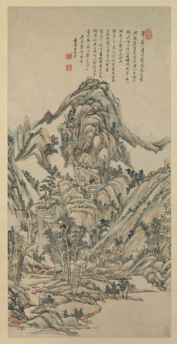 Wang derived his basic composition for this painting from the Yuan master Huang Gongwang (1269–1354), but he reduced the earlier artist's landscape forms to geometric shapes arrayed in twisting and turning echelons that set the entire mountainscape in motion. Contrasting colors and shifting ground planes further animate the composition.