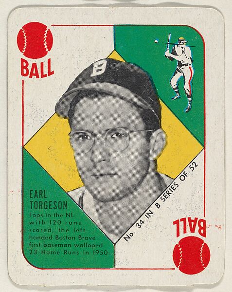 - Title: Card Number 34, Earl Torgeson, 1st Base, Boston Braves, from the Topps Red/ Blue Backs series (R414-5) issued by Topps Chewing Gum Company