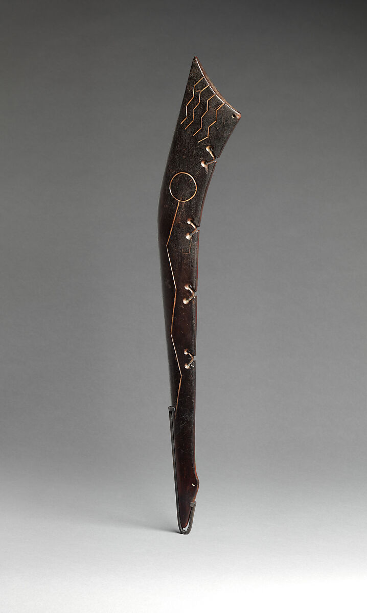This ceremonial club, popularly referred to as a gunstock club, takes the form of a deer leg and is inscribed with cosmological imagery: one side has thirty-seven four-pointed stars, and the other has the graceful image of a comet complemented by four zigzag lines. Holes and channels that span the trailing edge of the club may have held feathers or other adornments.