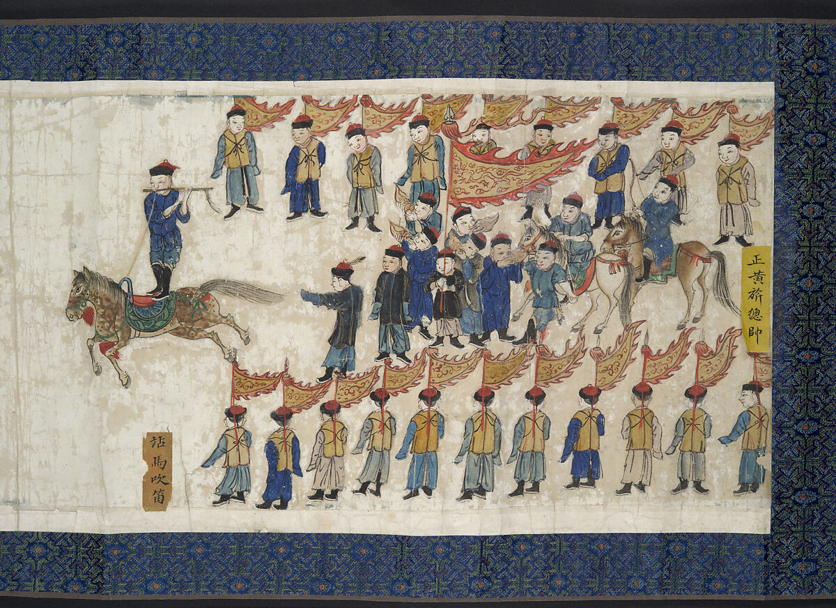 The painting which is probably a preparatory sketch, presents a file of horsemen each performing a different riding stunt (below). At the right end two rows of imperial bodyguards flank two horsemen who are about to perform. Five men blow conches to announce the next rider, while two officers, one identified by a peacock feather in his cap, direct. Each rider was originally accompanied by two label strips naming his pose and military unit. All of the horsemen belong to one of the three highest-ranking of the eight "banners" that divided the Manchu army.