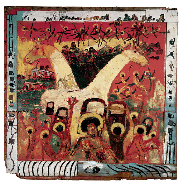 Young lived in a predominantly African American neighborhood of Miami called Overtown, on a street with abandoned bakeries known as Goodbread Alley. Inspired by the proliferation of mural movements across the United States (especially in communities of color) in the late 1960s, Young began his own project on the street. Hundreds of murals, including Locked Up Their Minds, covered the building facades. Painted on scavenged detritus from the neighborhood, they exemplify his art’s gestural brushwork, dynamic black figures, and vibrant color palette. In this work, the bottom figures lift padlocks above their heads, as if presenting them to the angels above. The figures and angels are separated by two imposing horses, which in Young’s visual language represent power and freedom.