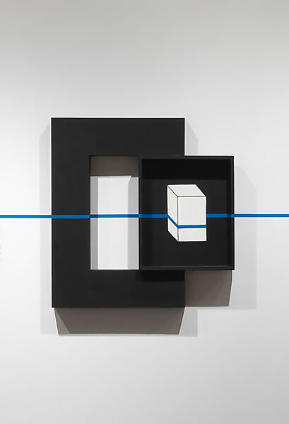Beginning his career as an illustrator and designer, Krasiński explored the relationship between the viewer and objects in space. His signature blue tape (always appearing at a height of 130 centimeters above the ground) operates as an optical interruption and unifying element that wraps all things and surfaces in its horizontal path, including works by other artists. In Krasiński’s series, Interventions, the tape passes over an axonometric drawing—a geometric rendering of a three-dimensional object on a two-dimensional surface—in a playful linear gesture that literally and conceptually fuses the artwork and the architectural space of the gallery.