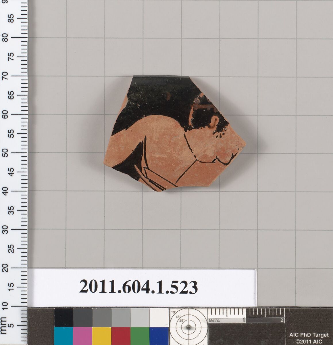 Exterior, head, upper torso, and right arm of a symposiast holding a kylix; to the left of the head, an omicron