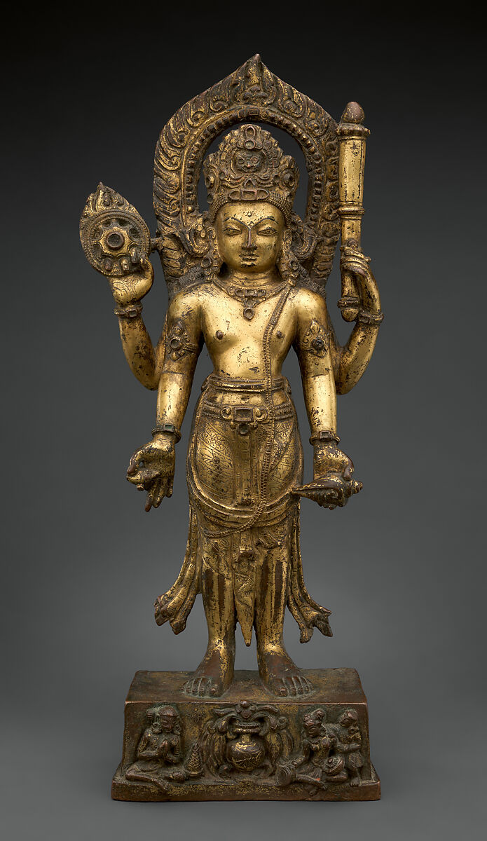 This heroic representation of Vishnu wearing an elaborate crown stands on a plinth depicting the donor and his family flanking an auspicious vase of plenty (purnaghata). The dedicatory inscription identifies the donor as a minister of state, names the king he served, Simhadeva, and gives the place and date of dedication. The date coincides with Vishnu’s awakening after his annual four-month slumber, marking the end of the monsoon— an auspicious day to make a religious donation.