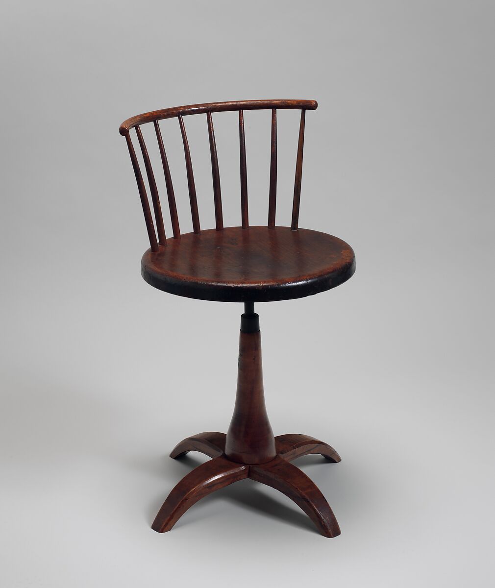 Revolving chairs, also known as stools or swivel chairs, were produced by Shakers in many styles and sizes. The earliest examples stood on long legs and often were used in the brethren's shops. Low revolving chairs, such as this example, with Windsor-like comb backs were rarely made before 1840.