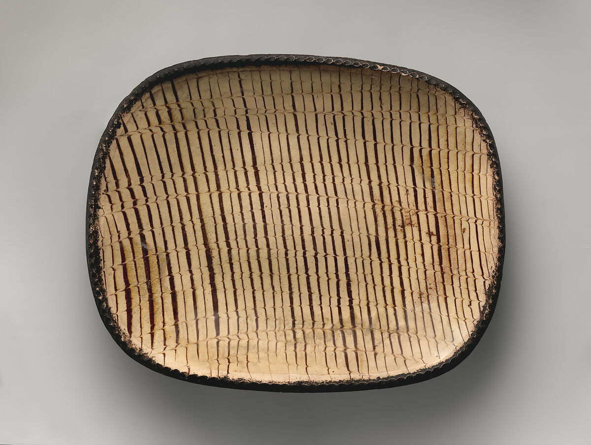This dish, which may have been used either for baking or serving, is decorated with two colors of slip, a term used for clay diluted with water. On this dish, the interior was covered with a cream-colored slip over which brown slip was applied in stripes. While both slips were still wet, a comb or similar utensil was used to create the subtle distortions in the brown lines that give the dish its aesthetic impact.