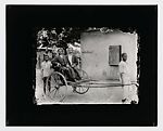 Untrimmed black and white photograph Black and white photograph (printed by Jerry L. Thompson in 1975, NY.) The subjects in this image are two suited men in a wooden pull cart; they are attended by a young boy in white shirt and black cap and the cart’s driver, a more mature man wearing a white shirt and wrap. An outdoor image, the setting includes at three visible structures, a sprawling tree, and a sign indicating the street name as “Küam Str.” The wooden window shutter on the building hangs slightly open and has the year ‘1910’ lightly scratched onto it.