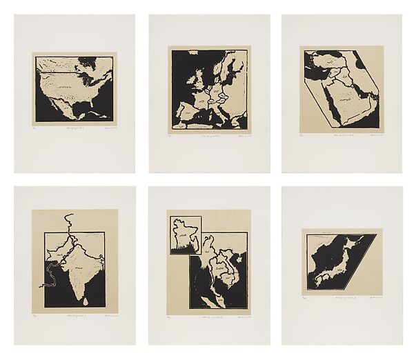 This work of art is currently on loan to the museum.This portfolio of six woodcuts comprises maps representing countries and states that Zarina has worked in or visited. Within each area, the specific place-names known to her are identified by Urdu inscriptions. In the depiction of the Indian subcontinent, the jagged boundary betewen India and Pakistan extends beyond the frame. Based on a drawing by the British colonial officer Sir Cyril Radcliffe, the line conveys the sense of rupture that defined the birth of the two nations in 1947 and the profound dislocations that followed for families on both sides, including that of the artist. Other maps portray the United States, Europe, Southeast Asia, Japan, and the Arabian Gulf. The last includes mamlakat saudia (Kingdom of Saudi Arabia), turkiya (Turkey), 'iraq (Iraq), and sham (Syria), whose current political misfortunes form an ongoing subtext in Zarina's imagery.