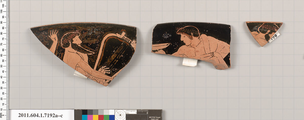 Exterior, head and upper body of a wreathed youth with his himation draped over his left shoulder, around his lower body, and over his left arm, holding a kylix in each hand; a second rim fragment depicts a left forearm and hand of a figure to right and a wreathed, bearded man, playing the barbiton; a third rim fragment depicts part of the head, neck, right shoulder, and upper back of a wreathed, bearded man to right, with his himation draped over his left shoulder